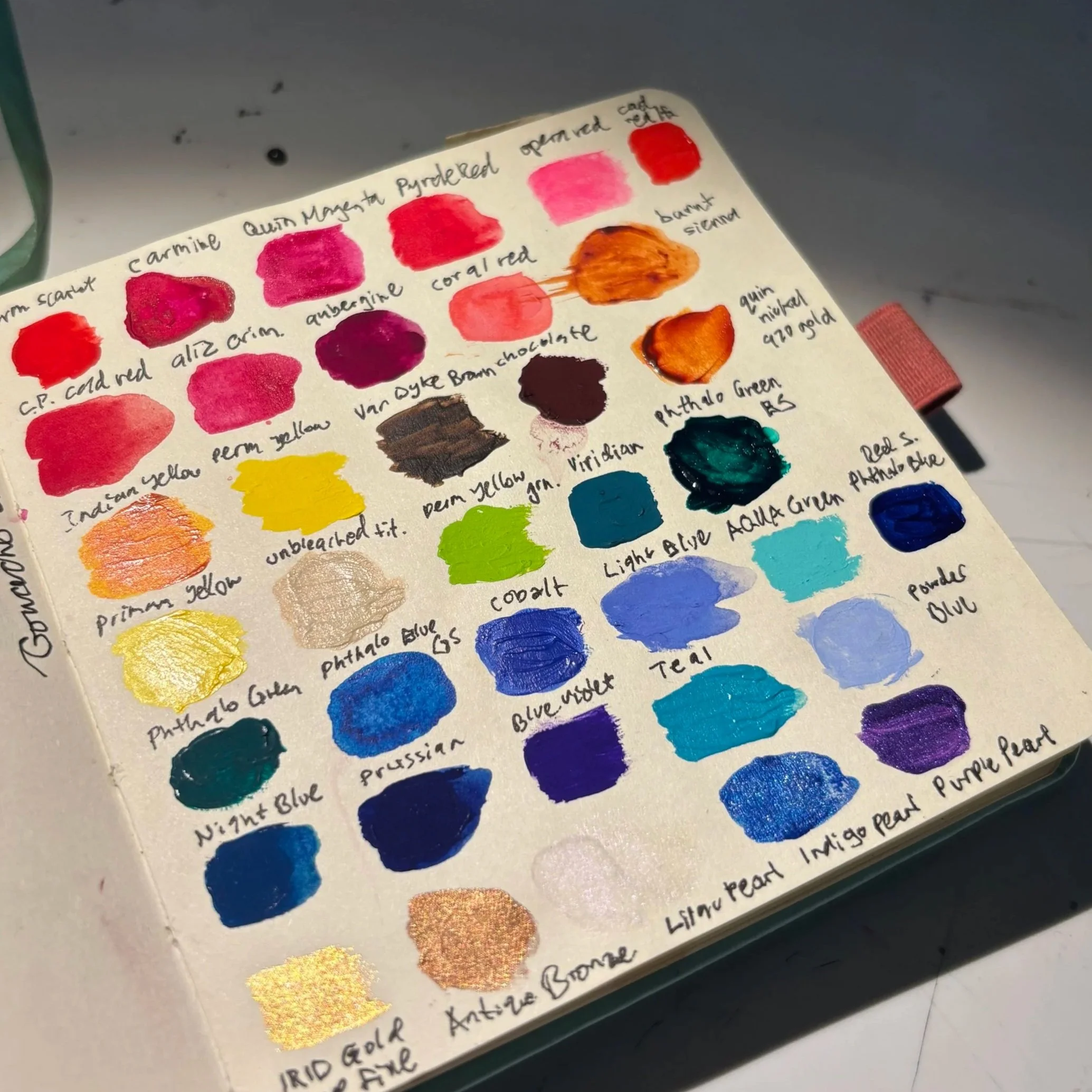 My acrylic paint inventory with names and swatches