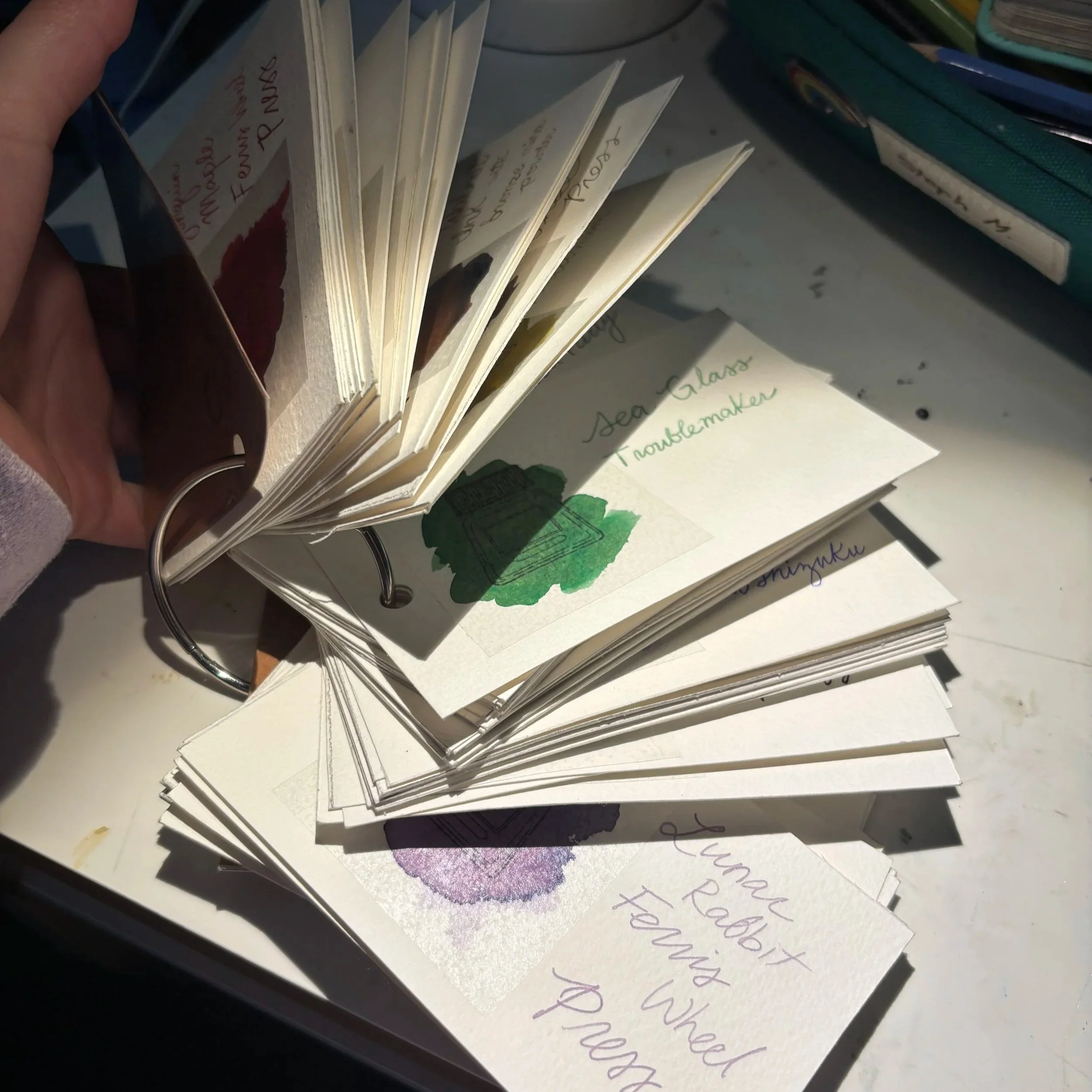 I have my own system for inks. I organize based on colour and keep them on a metal ring for easier find-ability. I put a large dab of colour on cut watercolour paper, with the written ink name next to it, and covered with a piece of clear vinyl so the ink doesn’t get transferred to other papers. I’ve also seen many people organize things in a book form so that you can see many colours at once.