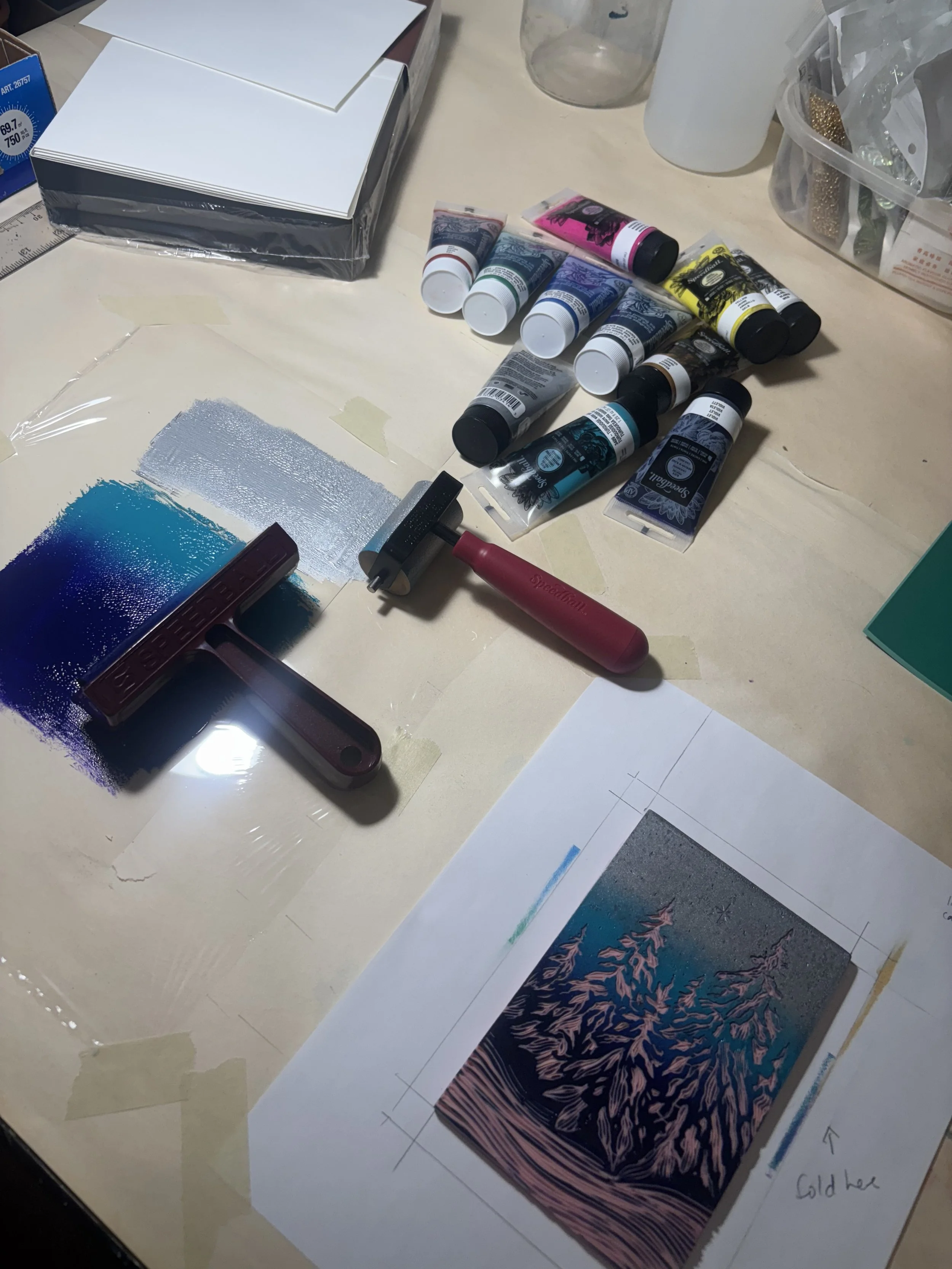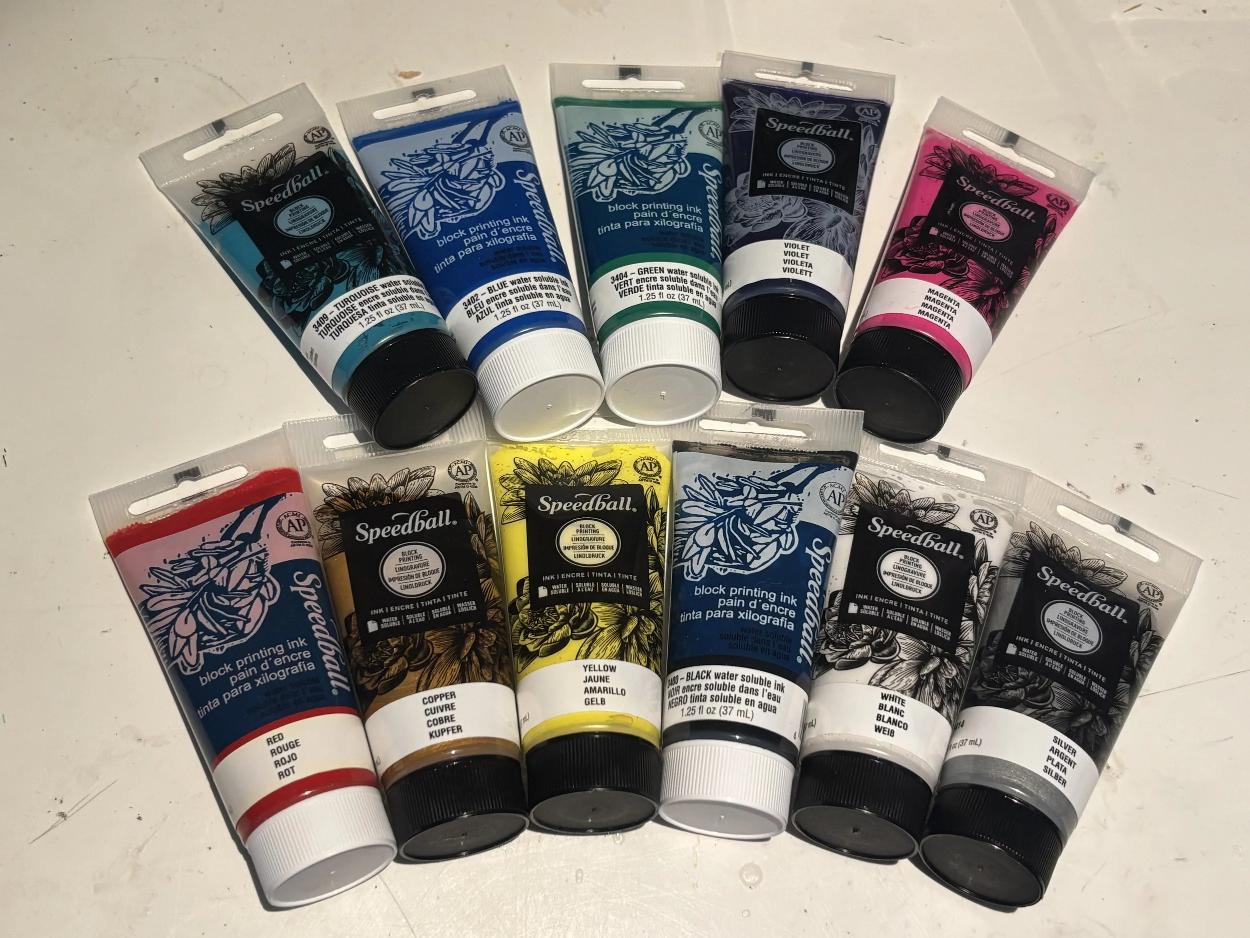 I hope you can see improvement because I think I do! My materials for these include: Speedball handle and blades, Speedball rubber brayer (hard), Speedball pink professional lino block, Strathmore mixed media cards, and Speedball printing inks. To do final touches I’ll also add on watercolour pencil, inks, and gold/silver/white markers.