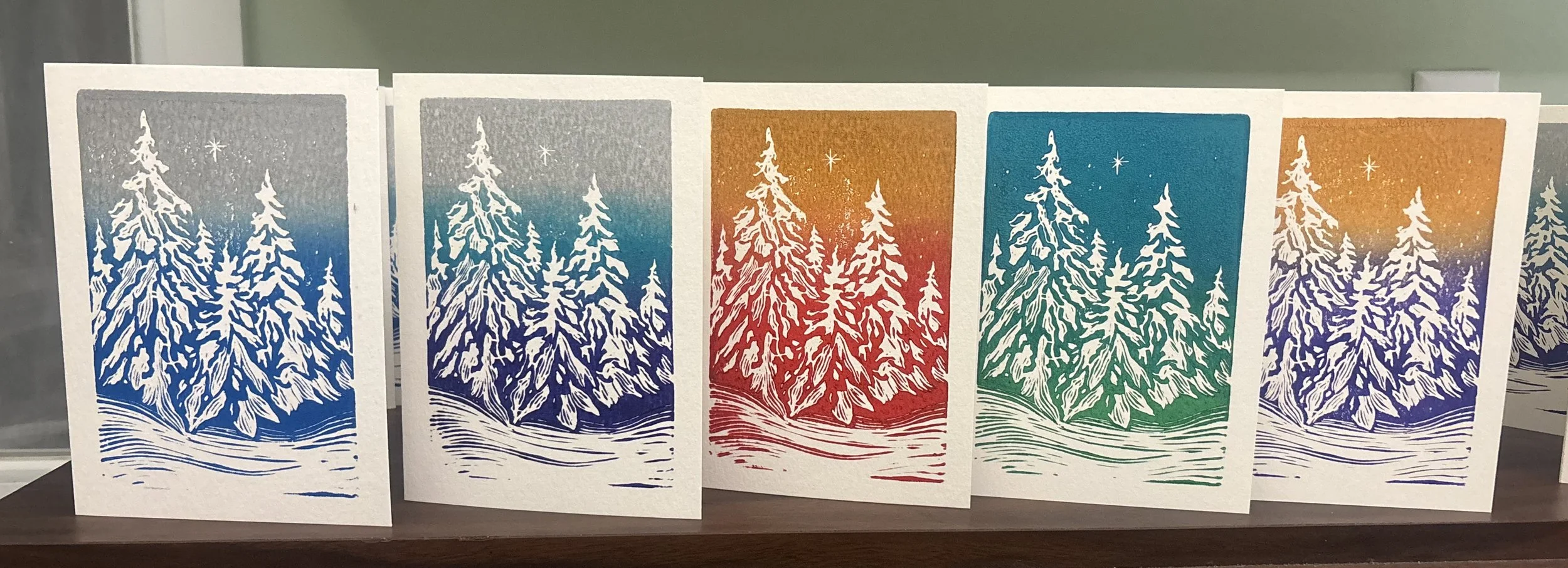 I’ve done printmaking several years in a row for my Christmas cards since I like making one design and then reprinting it in a variety of colours to get my cards done in a big batch yet still have unique colours and a handmade touch. Below is my card from my second year, featuring a clear blue night sky with the moon, a fresh coat of snow and a log cabin. We won’t talk about the card from first year, haha.