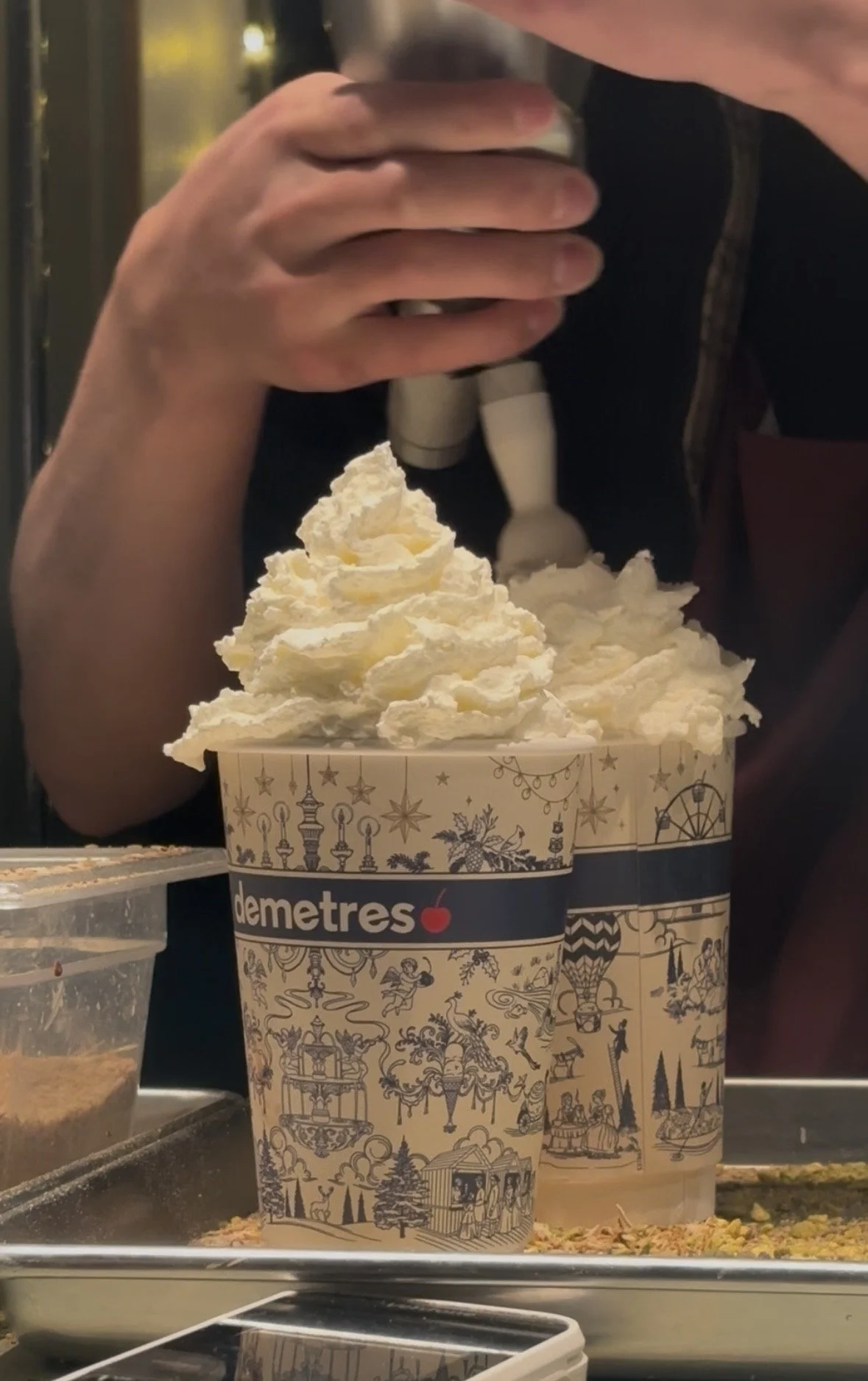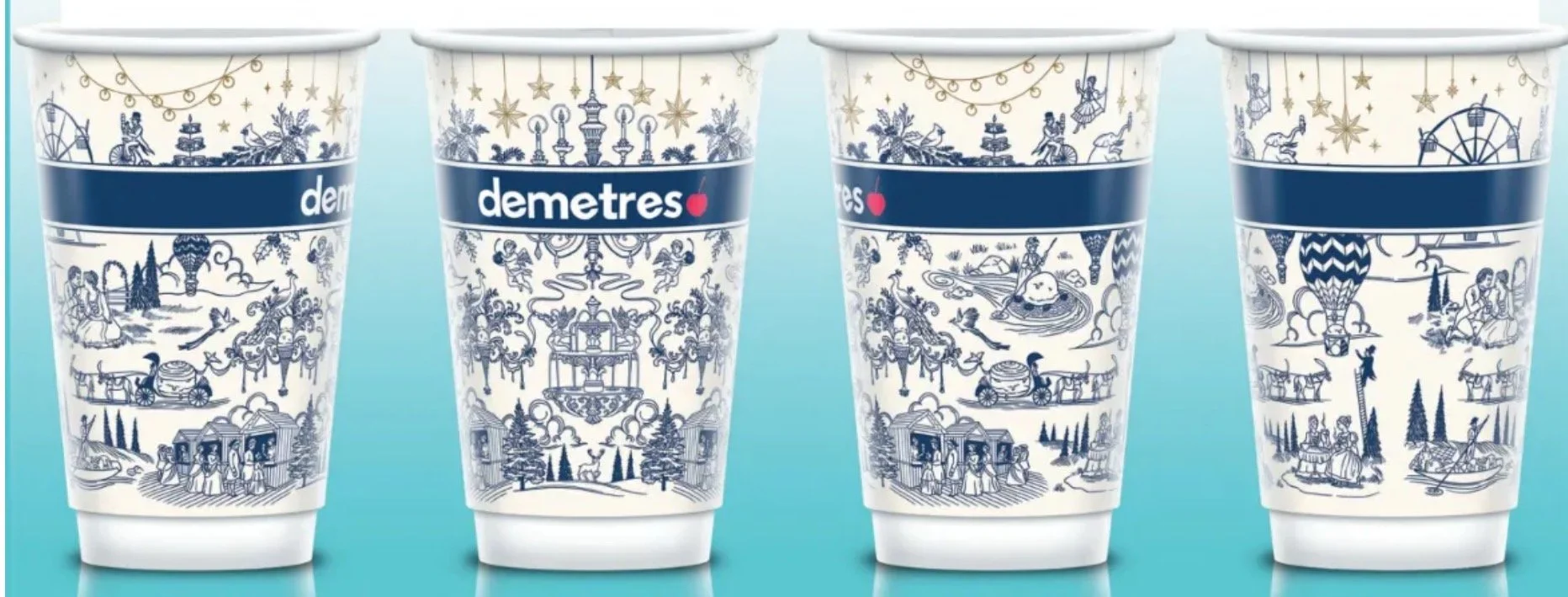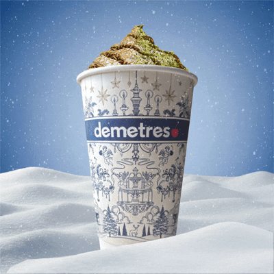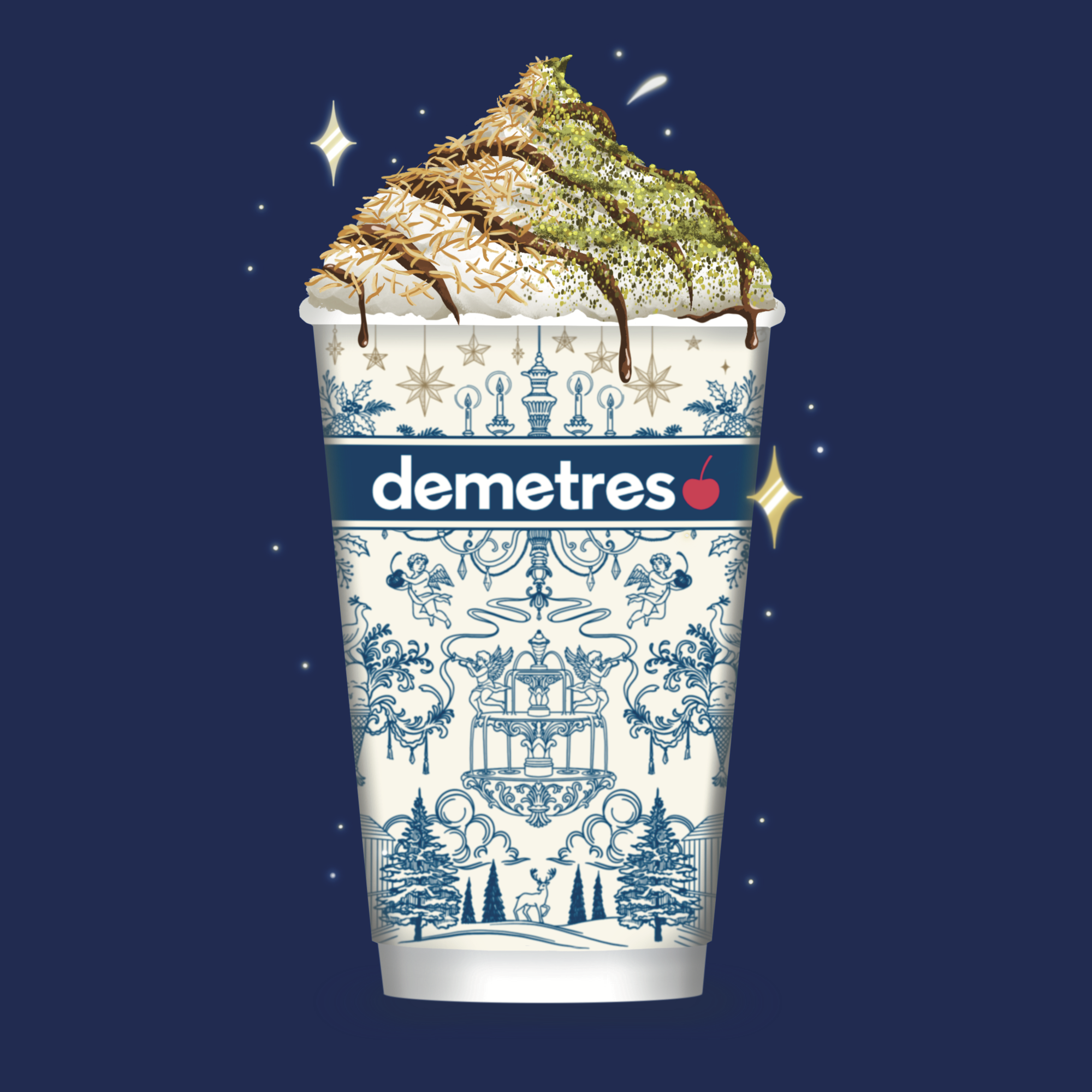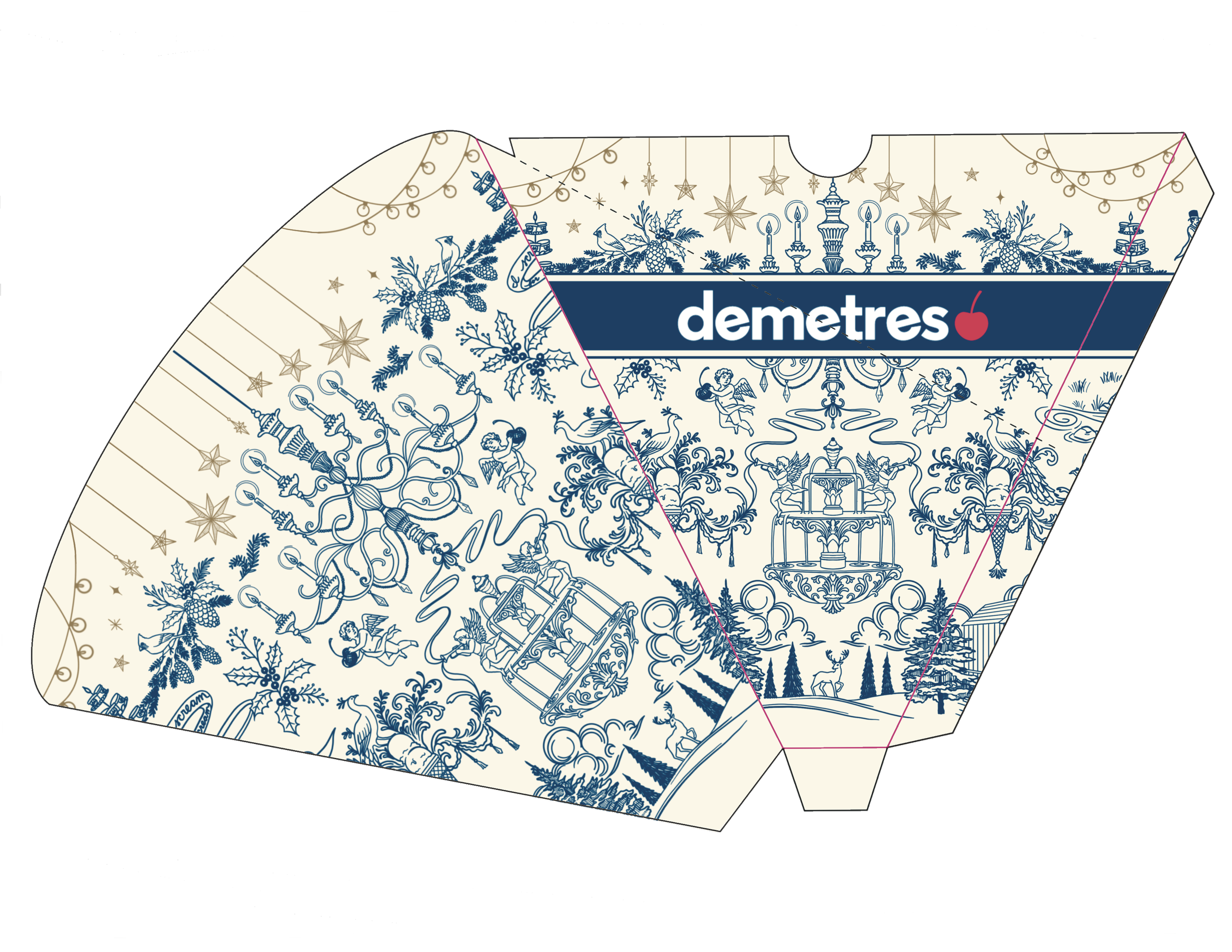 Imagery features a vintage-feel toile de jouy pattern and Demetres dessert “easter eggs” throughout. Including scooped icecream, waffles, croissant buns, the winter village cabins and more.